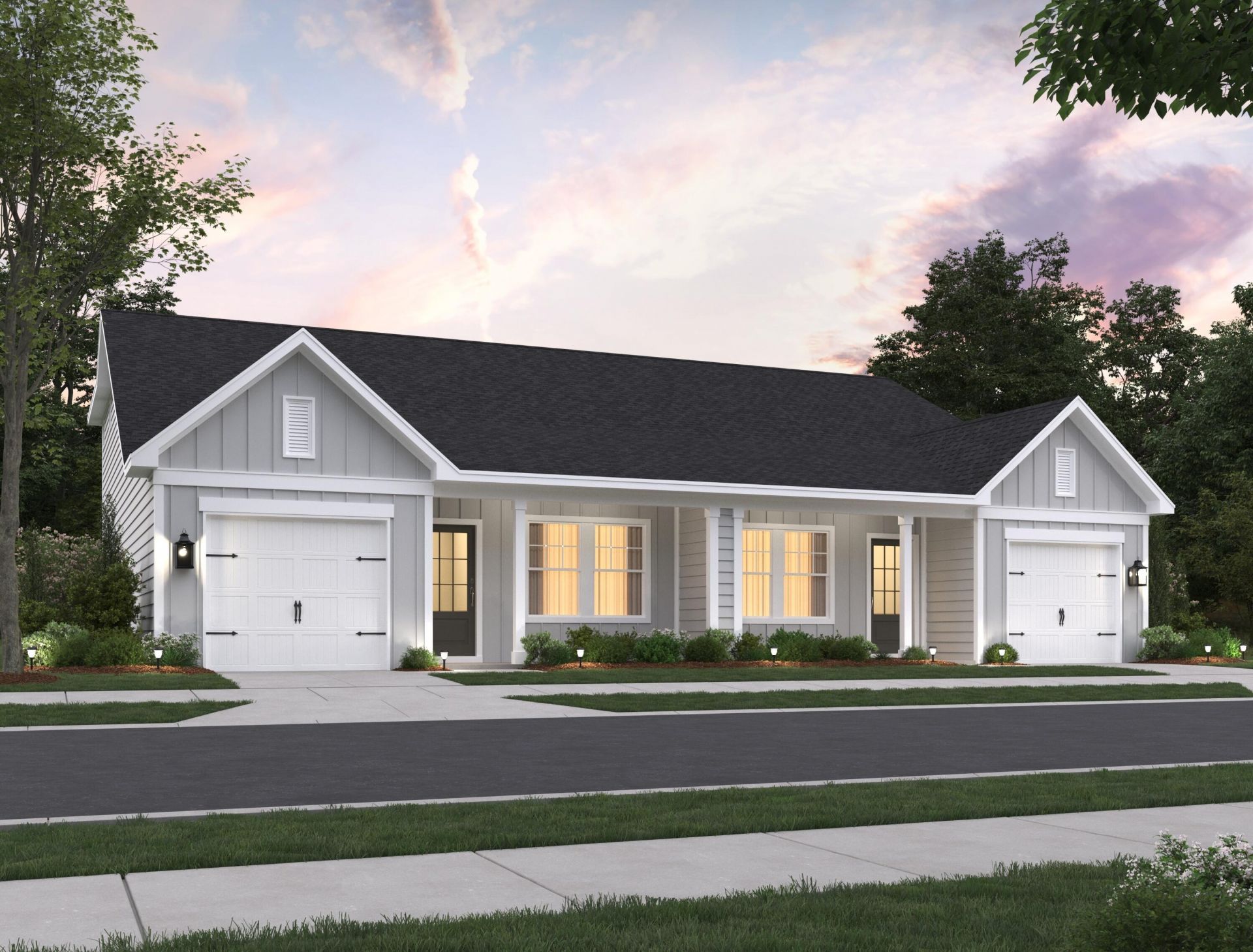 Designed for those who value comfort, connection, and low maintenance living in a peaceful yet vibrant setting, 1069 Dusk Drive offers an inviting opportunity in Hammock Walk at Nexton by Ashton Woods Homes. This beautifully designed new construction one story villa is finished with curated cosmetic selections from the Serene design collection, featuring alabaster cabinetry, warm brass hardware, and light luxury vinyl plank flooring throughout the main living areas for a bright, calming feel.The kitchen is thoughtfully designed with a gas range, generous counter space, and a natural flow into the open family room, which enjoys abundant natural light and opens to an expanded rear porch overlooking a tranquil, wooded setting. Just inside the front of the home, a secondary bedroom with a spacious walk in closet provides flexibility for guests or a home office, while the long one car garage allows for both parking and additional storage. The primary bedroom is privately situated at the back of the home and features a well appointed en suite bathroom with a zero entry tiled luxury walk in shower and a large walk in closet. Residents of Hammock Walk enjoy access to community amenities including a dog park, pickleball courts, walking and jogging trails, and a pavilion area. Ideally located within the award winning Nexton master planned community, this home also offers access to miles of trails, parks, shopping, dining, and a lifestyle that blends everyday convenience with natural surroundings.